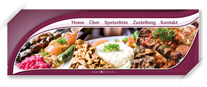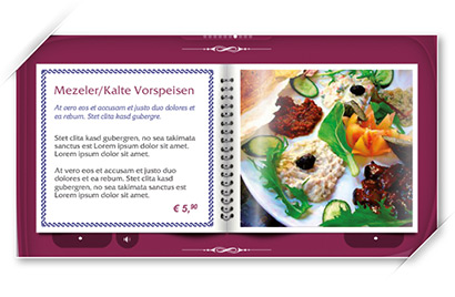 Die Speiseliste wurde als Flash-Animation umgesetzt, die das Umblättern einer visuellen Speisekarte simuliert. Links sind die Speisen und Preise in einem Rahmen aufgelistet, rechts die entsprechenden Bilder.