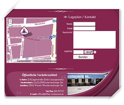 Das Kontaktformular mit Captcha. Lageplan wurde mit „Google Maps Api“ realisiert. Das Farbschema und die Icons von Google Maps wurden an die Webseite angepasst.