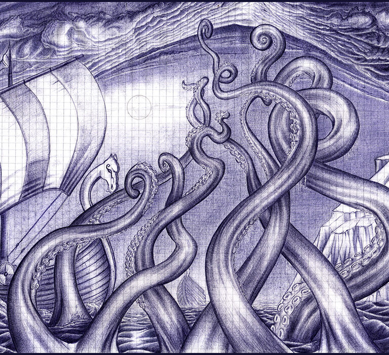 Riesen-Octopus Im Fokus der Darstellung erhebt sich ein gigantischer Oktopus mit seinen wild aus dem Wasser aufragenden Armen, während ein Wikingerschiff ahnungslos in diese dramatische Szenerie steuert. Im Hintergrund sind bereits Schiffe gesunken, und Wrackteile treiben auf dem Meer umher. Auf der rechten Seite ist ein Eisberg abgebildet, der das Bild vervollständigt. Es breiten sich …